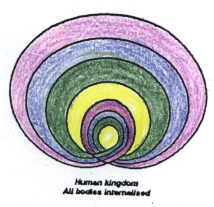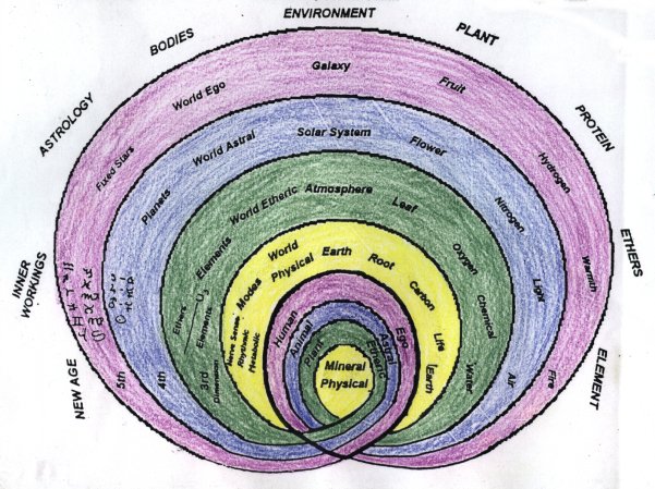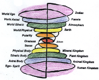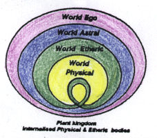 Putting all the above information together a picture of life's interrelationships as a Microcosm of the Macrocosm develops as follows. This diagram outlines the internalisation of the World spiritual bodies into the personalised kingdoms of nature through their various associations.