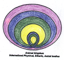 The Animal Kingdom embodies the Etheric and Astral, inside their physical bodies, while the Ego stays external. This allows them movement and sensation, but not a high degree of 'consciousness'. So if the food or temperature is not right in one position, then they will move to another. While a degree of freedom is expressed here, it is usually based on sense experience or habit and instinct. The degree the astral is internalised is indicated by the formation of the four organic systems of lung, kidney, bladder and heart. (16)